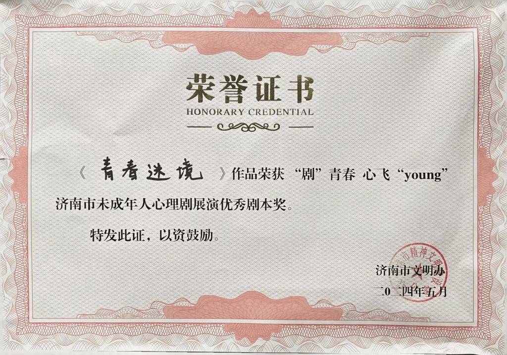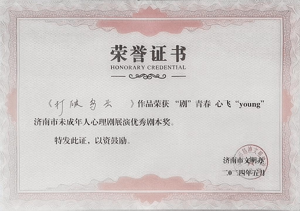 5月25日下午,由济南市委宣传部(市文明办)主办的“‘剧’青春,心飞扬”济南市未成年人心理剧展演在芳华音乐厅正式启幕。由经济学院选送,杨延昌老师和张倩倩老师共同指导的两部心理情景剧作品《打破乌云》和《青春迷境》,荣获优秀剧本奖。