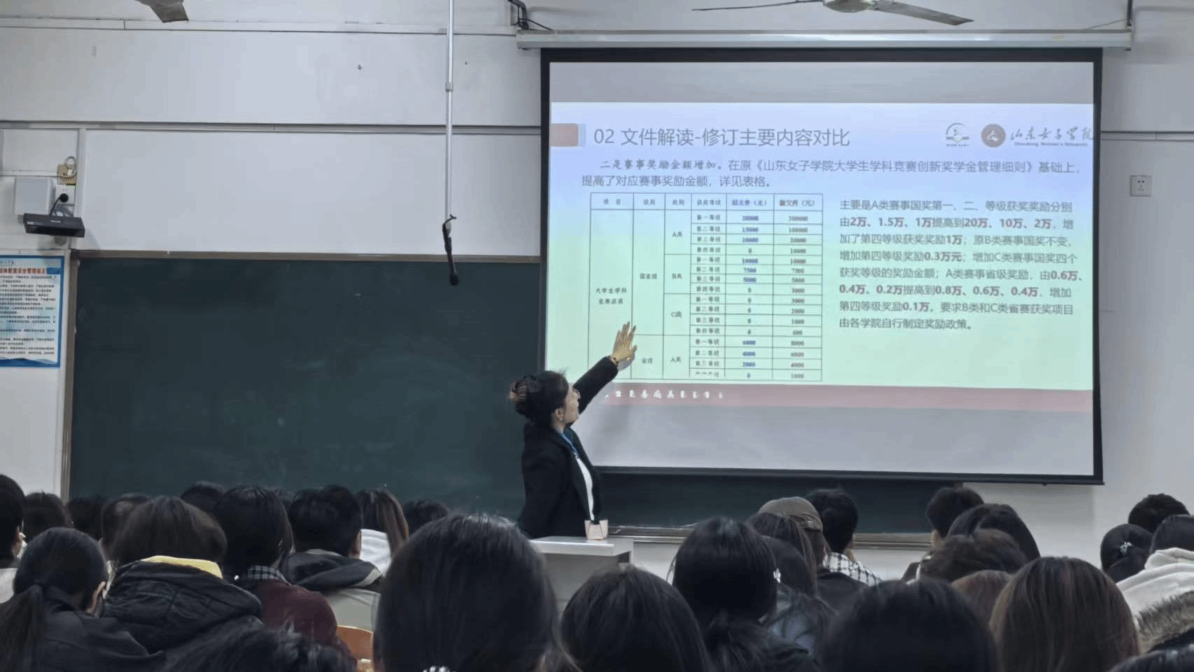 董老师首先介绍了参与学科竞赛在提升学生的专业技能、综合素质、以及学生的未来就业和深造方面存在的积极的作用。随后董老师进行了文件讲解,梳理了赛事文件的修订要点,并围绕政策与赛事基础、备赛与工作安排、项目方向与赛道等核心内容展开了详细指导。解读中明确了A、B、C类赛事的分类标准及其对应的奖励调整细则,同时,聚焦女性教育、文旅结合、数字赋能等重点领域,配套专业依托与案例参考,为学生备赛提供了更佳的选题方向。互动环节中,董老师对新生在备赛过程中常有的困惑进行了分析与解答。