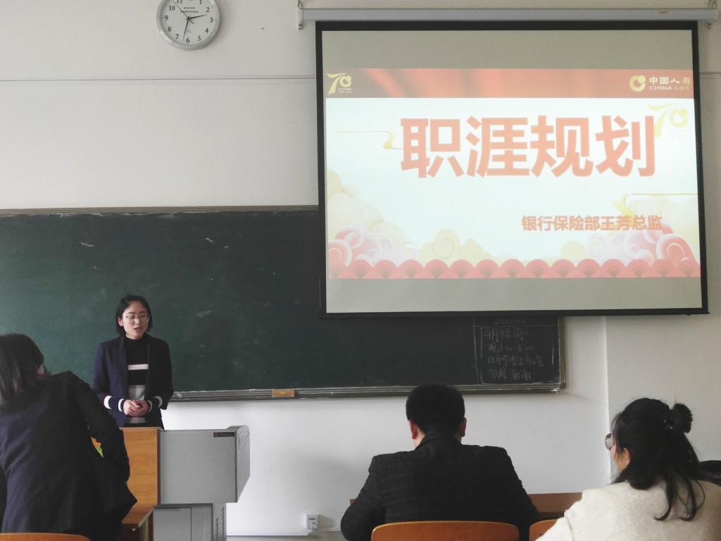 为进一步帮助学生了解银行保险专业信息,认清就业形势,转变择业观念,提高毕业生就业质量,2019年4月12日下午,经济学院邀请中国人寿保险公司总监王芳、经理郑磊磊在博学楼112为毕业生做报告,经济学院温春然老师和2019届、2020届毕业生参加了报告会。