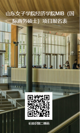 4、报名条件:山东女子学院商科本科大一至大四学生,均可根据个人意愿报名参加MIB项目。大四报名学生如果同时满足GPA要求和语言要求,可直接进入课程;大二大三报名学生,按照入学标准,对语言+专业课进行强化训练。大一报名学生,按照入学标准,对语言+专业课进行一站式全程规划指导。